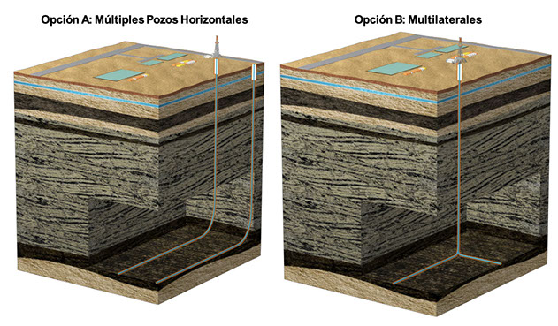 Opción A – Perforar dos pozos: Esta es la opción más costosa, ya que se requiere repetir actividades similares, preparar dos ubicaciones en superficie y movilizar el equipo de perforación.