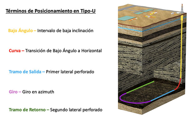 A medida que los pozos en forma de “U” se están volviendo más comunes, se han adoptado ciertas convenciones de nomenclatura para identificar posiciones a lo largo de la trayectoria. En este artículo se utilizarán los siguientes términos para referirse a la posición del conjunto de fondo (BHA) o al describir la trayectoria: intervalo de ángulo bajo, curva, tramo de salida, giro y tramo de retorno.