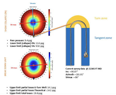 La primera etapa del proyecto consistió en realizar estudios de factibilidad en perforación y geomecánica para determinar las posibles cargas de perforación asociadas con la compleja trayectoria en forma de “U” y los efectos de un cambio de 180° en el azimut.
