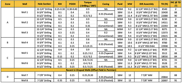 Revisión de pozos cercanos : Se evaluaron múltiples pozos cercanos para obtener los posibles factores de fricción relacionados con el torque y el arrastre, sirviendo como referencia para determinar si la trayectoria en forma de “U” podría ejecutarse con el rig seleccionado. Esta evaluación también ayudó a identificar brechas operativas y prácticas de alto riesgo en la perforación, los viajes de tubería y la corrida de revestimiento, que podrían afectar directamente el desempeño del proyecto. La Tabla 1 presenta una revisión general de los pozos horizontales cercanos analizados en el área aledaña (pozos 1 al 6), así como dos pozos en “U” perforados recientemente en una cuenca diferente (pozos 7 y 8). Aunque estos pozos no se encuentran en la misma zona, proporcionaron información valiosa para el enfoque propuesto.