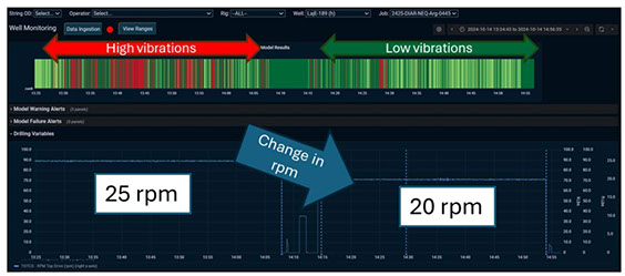 El monitor de vibraciones de Tenaris utiliza un modelo de IA para identificar condiciones peligrosas para el casing basándose en datos de pozos anteriores, es decir el modelo va aprendiendo con la experiencia. El sistema muestra esta información en tiempo real al usuario y le permite modificar los parámetros de perforación para reducir los daños al casing. La siguiente imagen es una captura de pantalla de la aplicación; los eventos peligrosos de vibraciones (rojo) se reducen a medida que se reducen las rpm (línea azul). Cabe destacar que una diferencia de tan solo 5 rpm puede modificar la condición vibracional de la tubería de revestimiento.