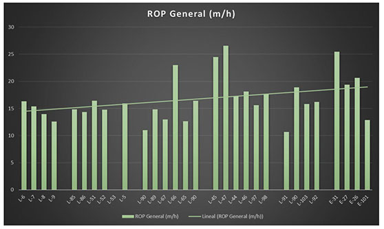 En un inicio siempre la recomendación era bajar y/o controlar ambas variables; sin embargo, en las últimas asistencias observamos que se ha podido perforar con mayores RPM y menor WOB sin afectar el nivel de vibraciones, y esto se tradujo en una tendencia evidente a mejorar las ROP de los pozos perforados en el área, como se muestra en el grafico siguiente.
