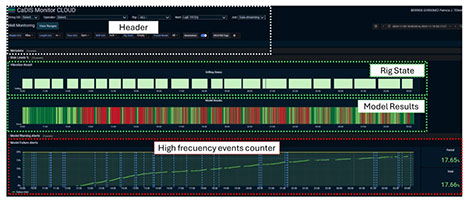 El resultado principal de todo este sistema es un algoritmo de clasificación de patrones que cataloga la condición de vibración de la perforación en cada segundo. Los eventos considerados dañinos (rojo) se contabilizan con un umbral de eventos acumulados máximos definido por la experiencia recopilada en otras operaciones. La siguiente imagen es una captura de pantalla de nuestra herramienta basada en la nube.