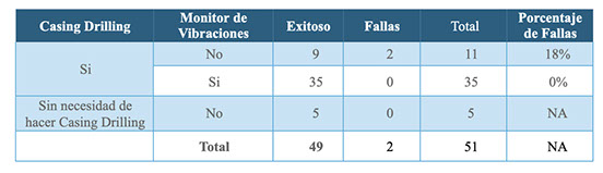 La siguiente tabla resume el número de sartas perforadas con perforación con casing hasta febrero 2025, con el detalle del número de fallas: