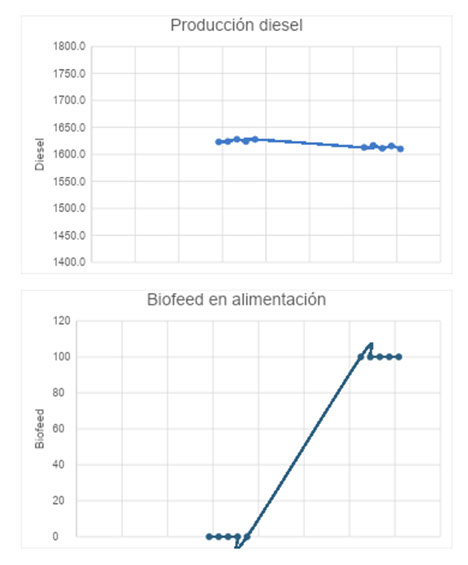 Para la segunda etapa del Test run se añadió carga Bio de forma escalonada, hasta llegar a un 6% de la alimentación; reduciendo la carga fósil para mantener la carga total en la unidad