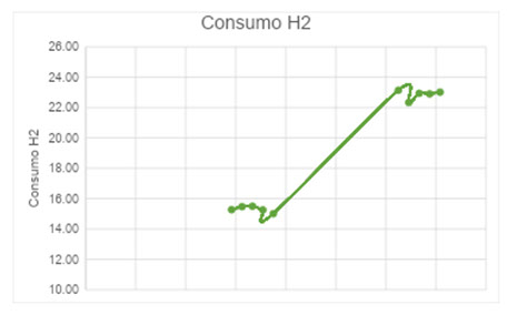 El consumo neto de hidrógeno en las reacciones de hidrodesulfurización se calculó como la entrada de gas fresco a la unidad; restando el OffGas remanente que se rutea a la unidad de tratamiento de gas; estos caudales normalizados por el % en peso de hidrógeno correspondiente, obtenidos de la cromatografía gaseosa analizada.