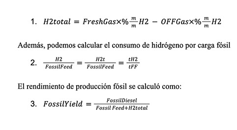 Con esta etapa obtuvimos dos datos clave: el consumo de hidrógeno de la carga fósil y el rendimiento de la alimentación fósil.