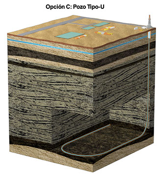 Una tercera opción, conceptualizada e implementada por Shell en 2019 (Merzoug et al., 2023), es la perforación en forma de "U", como se ilustra en la Figura 2. Este enfoque permite lograr una longitud lateral considerable a lo largo del yacimiento, eliminando la necesidad de perforar el “overburden” adicional requerido en la opción A, y evitando las complejidades asociadas con la perforación de pozos multilaterales, como en la opción B.