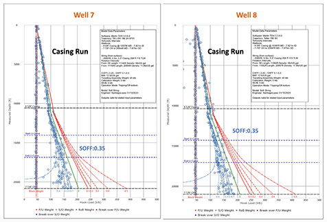 Uno de los logros clave fue la corrida de casing flotado, que requirió una rotación mínima para alcanzar la profundidad total (TD). La Figura 8 muestra una gráfica de arrastre en tiempo real de esta operación, donde la fricción al correr (slack-off drag) coincidió estrechamente con las predicciones del factor de fricción obtenidas mediante análisis de pozos offset. La posición del sub de flotación se optimizó con base en actualizaciones del modelo en tiempo real, lo que contribuyó a una instalación eficiente.