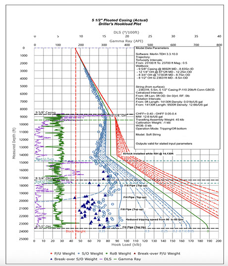 La optimización del posicionamiento del sub de flotación en el revestimiento flotado tiene una influencia clave en el éxito de la corrida. La corrida de revestimiento en elevadores depende en gran medida de la posición del sub. Una estrategia efectiva fue actualizar diariamente la gráfica de fricción (hookload drag plot) con la trayectoria real perforada, para obtener una idea precisa de la ubicación óptima del sub de flotación antes de la corrida del revestimiento, ya que esto incluso podría proporcionar un margen adicional de peso al bajar (slack-off) en comparación con la posición planificada inicial del sub. A pesar de que algunos pesos de iniciando a mover el casing (breakover slack-off) se acercaron al peso de los bloques del equipo, esto se manejó controlando las velocidades de viaje y llenando la tubería por encima del sub de flotación para proporcionar más peso y ayudar a empujar el revestimiento hacia el fondo.