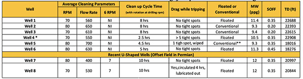 La evaluación del factor de fricción (FF) durante la corrida de revestimiento requiere un enfoque similar; sin embargo, se consideró importante evaluar las condiciones del pozo para identificar posibles problemas que deban abordarse a fin de aumentar la probabilidad de que el revestimiento llegue a la profundidad total. La Tabla 2 resume las condiciones del pozo relacionadas con la limpieza del pozo, los viajes de tubería y la corrida de revestimiento en los pozos cercanos