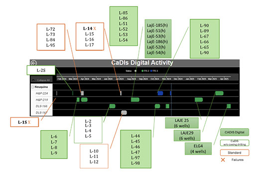 A partir de ese momento, todos los pozos subsiguientes se perforaron con el sistema monitor de vibraciones. La siguiente cronología muestra la evolución del proyecto desde enero de 2024 hasta febrero 2025.