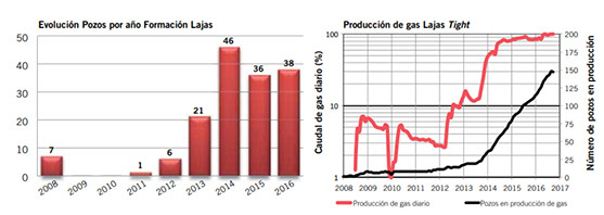 Figura 2: Lajas Tight Gas development 2011-2017- #wells and production (Federico Wagner, 2016).