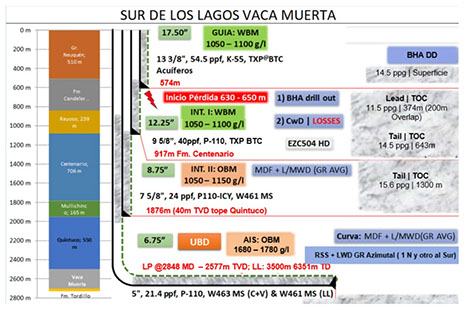 El siguiente esquema muestra el diseño inicial de un pozo típico y la indicación de CWD (Casing While Drilling) en la sección intermedia con casing de 9 5/8" desde 600 m hasta 950 m aproximadamente. Se implementa la perforación con casing cuando se detectan pérdidas totales de fluido de perforación en la sección Candeleros / Rayoso.