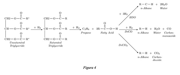El hidrotratamiento de aceite ocurre en etapas, donde cada una requiere distintas cantidades de H2. La primera etapa es la hidrogenación/saturación de los enlaces múltiples de las cadenas de ácidos grasos del triglicérido. El siguiente paso luego de la saturación del triglicérido consiste en el hidrocraqueo del mismo en una molécula de propano y tres ácidos grasos libres. Finalmente, para completar la conversión del ácido graso a hidrocarburo, la desoxigenación puede ocurrir de tres maneras distintas en función de los productos obtenidos:
