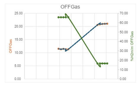 El consumo neto de hidrógeno en las reacciones de hidrodesulfurización se calculó como la entrada de gas fresco a la unidad; restando el OffGas remanente que se rutea a la unidad de tratamiento de gas; estos caudales normalizados por el % en peso de hidrógeno correspondiente, obtenidos de la cromatografía gaseosa analizada.