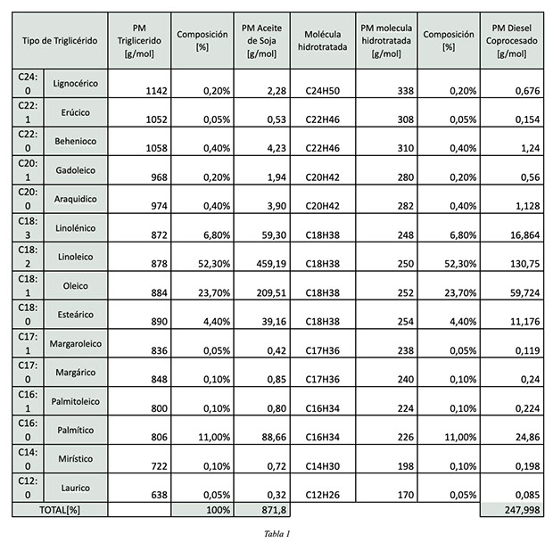 Se calcularon los pesos moleculares de cada triglicérido y se los multiplico por el % de composición en el aceite para determinar un peso molecular promedio de la materia prima. Lo mismo para el peso molecular Diesel Coprocesado