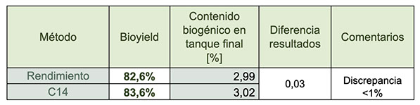 En la siguiente tabla se estima el porcentaje de diesel de origen biogénico según los rendimientos calculados por los dos métodos explicados anteriormente.